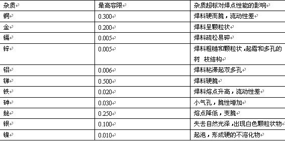 表1焊料雜(zá)質容限及對(duì)焊接質量的(de)影響