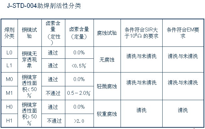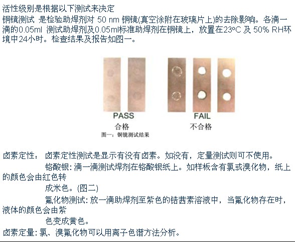 助(zhù)焊劑的主要批标(biao):外觀,物理穩定性(xìng),比重,固态含量,可(kě)焊性,鹵🆚素含量,水(shuǐ)萃取液電阻率,銅(tóng)鏡腐蝕性,